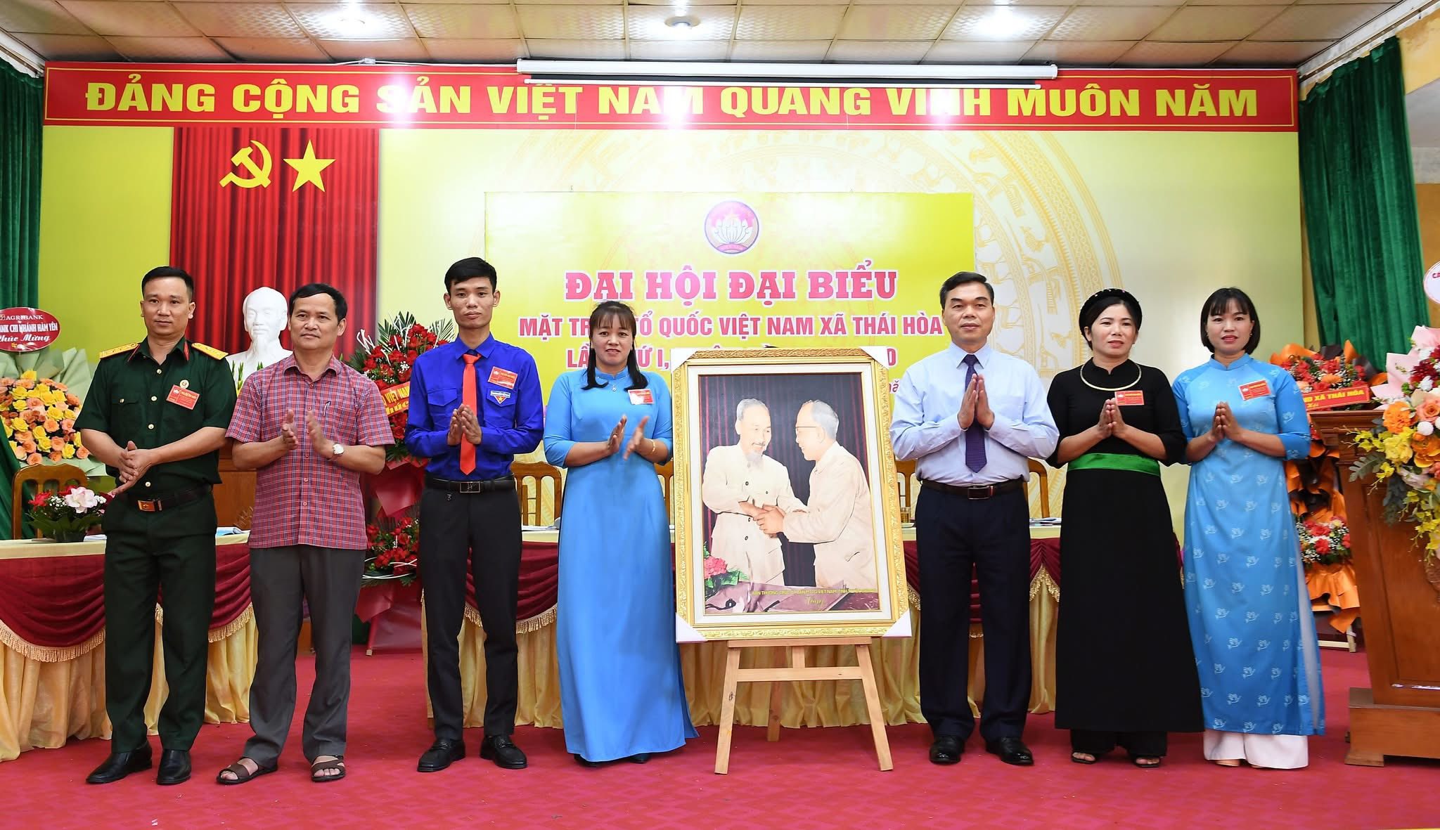Đồng chí Phó Bí thư Tỉnh ủy, Chủ tịch Ủy ban MTTQ Việt Nam tỉnh Tuyên Quang Ma Thế Hồng tặng Đại hội đại biểu MTTQ Việt Nam xã Thái Hòa bức tranh Bác Hồ và Bác Tôn