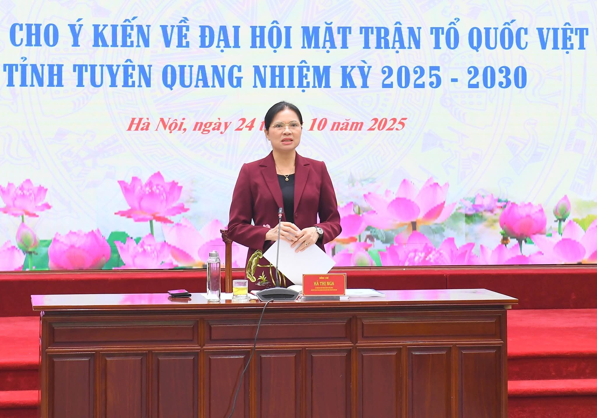 Sáng nay, 24/10, đồng chí Hà Thị Nga, Ủy viên Ban Chấp hành Trung ương Đảng, Phó Chủ tịch Ủy ban Trung ương MTTQ Việt Nam đã chủ trì buổi làm việc của Ban Thường trực Ủy ban Trung ương MTTQ Việt Nam cho ý kiến về công tác chuẩn bị Đại hội đại biểu MTTQ Việt Nam tỉnh Tuyên Quang nhiệm kỳ 2025-2030.