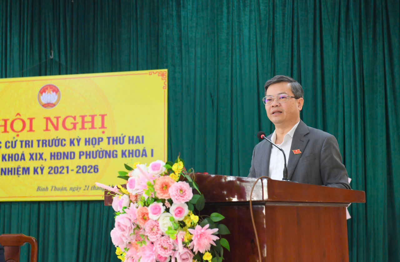 Phát biểu tại hội nghị, Chủ tịch HĐND tỉnh Nguyễn Văn Sơn đã ghi nhận, đánh giá cao sự nỗ lực của cấp ủy, chính quyền và toàn thể cử tri, Nhân dân trên địa bàn phường Bình Thuận ngay sau hợp nhất, sắp xếp đã đoàn kết, đồng lòng thực hiệu quả các mục tiêu đề ra, bộ máy mới của phường ngày càng hoạt động ổn định. Đồng chí đề nghị trong thời gian tới, Đảng ủy, HĐND, UBND phường tiếp tục quan tâm chỉ đạo triển khai thực hiện hiệu quả các mục tiêu về phát triển kinh tế - xã hội và bảo đảm quốc phòng, an ninh trên địa bàn, xây dựng phường có bước phát triển nhanh và bền vững.