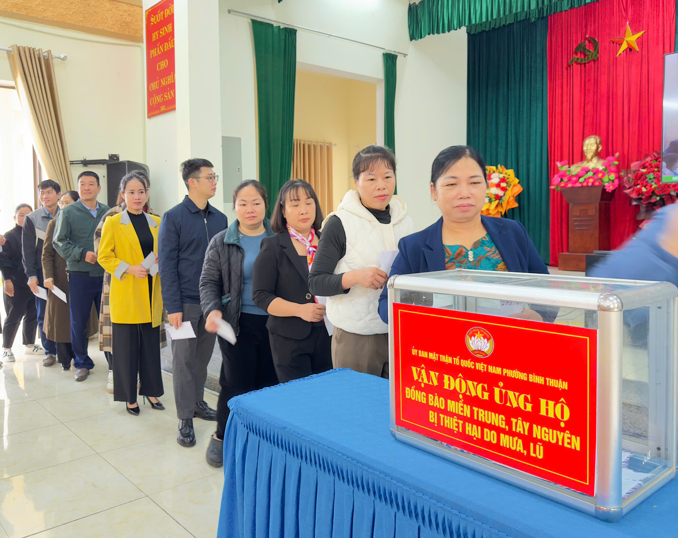 Trước tình hình mưa lũ đặc biệt lớn, nghiêm trọng tại miền Trung và Tây Nguyên, nhằm góp sức để giúp bà con Nhân dân Miền Trung, Tây Nguyên sớm vượt qua thiên tai, ổn định cuộc sống; các cơ quan, đơn vị, tổ chức chính trị-xã hội, lực lượng vũ trang, doanh nghiệp, cán bộ, đảng viên, đoàn viên, hội viên và Nhân dân trên địa bàn phường tích cực hưởng ứng Hội nghị hướng về đồng bào Miền Trung, Tây Nguyên ruột thịt; Mỗi tấm lòng, mỗi sự đóng góp dù nhỏ hay lớn đều vô cùng quý giá trong thời điểm này. Đảng ủy, HĐND, UBND, Ủy ban MTTQ Việt Nam phường sẽ chỉ đạo tổ chức tiếp nhận, tổng hợp và chuyển toàn bộ số tiền ủng hộ lên Ủy ban MTTQ Việt Nam tỉnh, để nguồn hỗ trợ bảo đảm kịp thời, đúng đối tượng, công khai, minh bạch, thể hiện trọn vẹn tình cảm và trách nhiệm của Đảng ủy, chính quyền và Nhân dân phường Bình Thuận đối với đồng bào vùng bị thiệt hại.