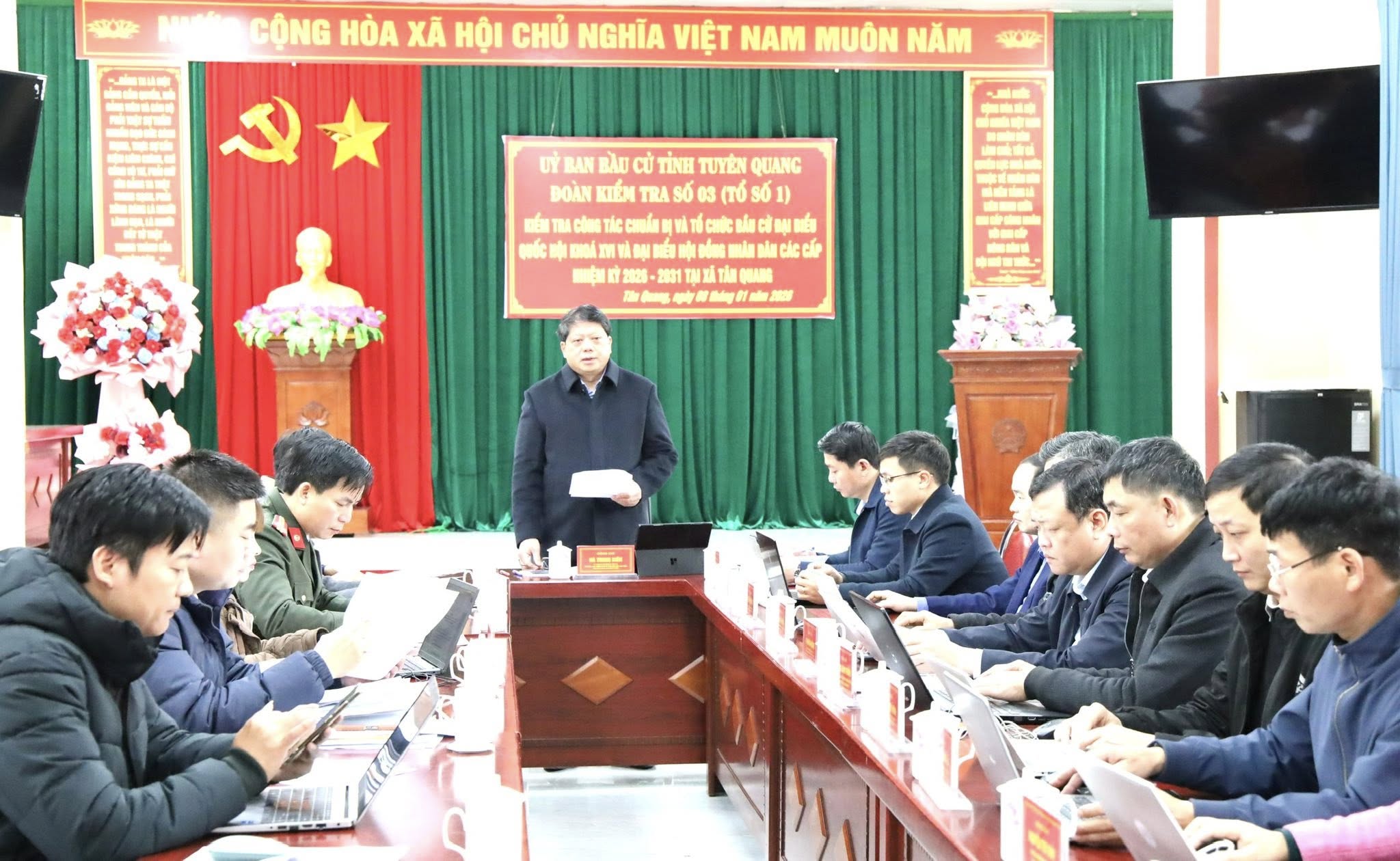 Tiếp tục chương trình làm việc, chiều nay 08/01, Đoàn kiểm tra số 3 (Tổ 01) Ủy ban bầu cử tỉnh Tuyên Quang do đồng chí Hà Trung Kiên, Ủy viên Ban Thường vụ Tỉnh ủy, Phó Chủ tịch Thường trực Ủy ban MTTQ Việt Nam tỉnh, Phó Chủ tịch Ủy ban bầu cử tỉnh làm Trưởng đoàn đã kiểm tra công tác chuẩn bị bầu cử đại biểu Quốc hội khóa XVI và đại biểu HĐND các cấp, nhiệm kỳ 2026 - 2031 tại xã Tân Quang.