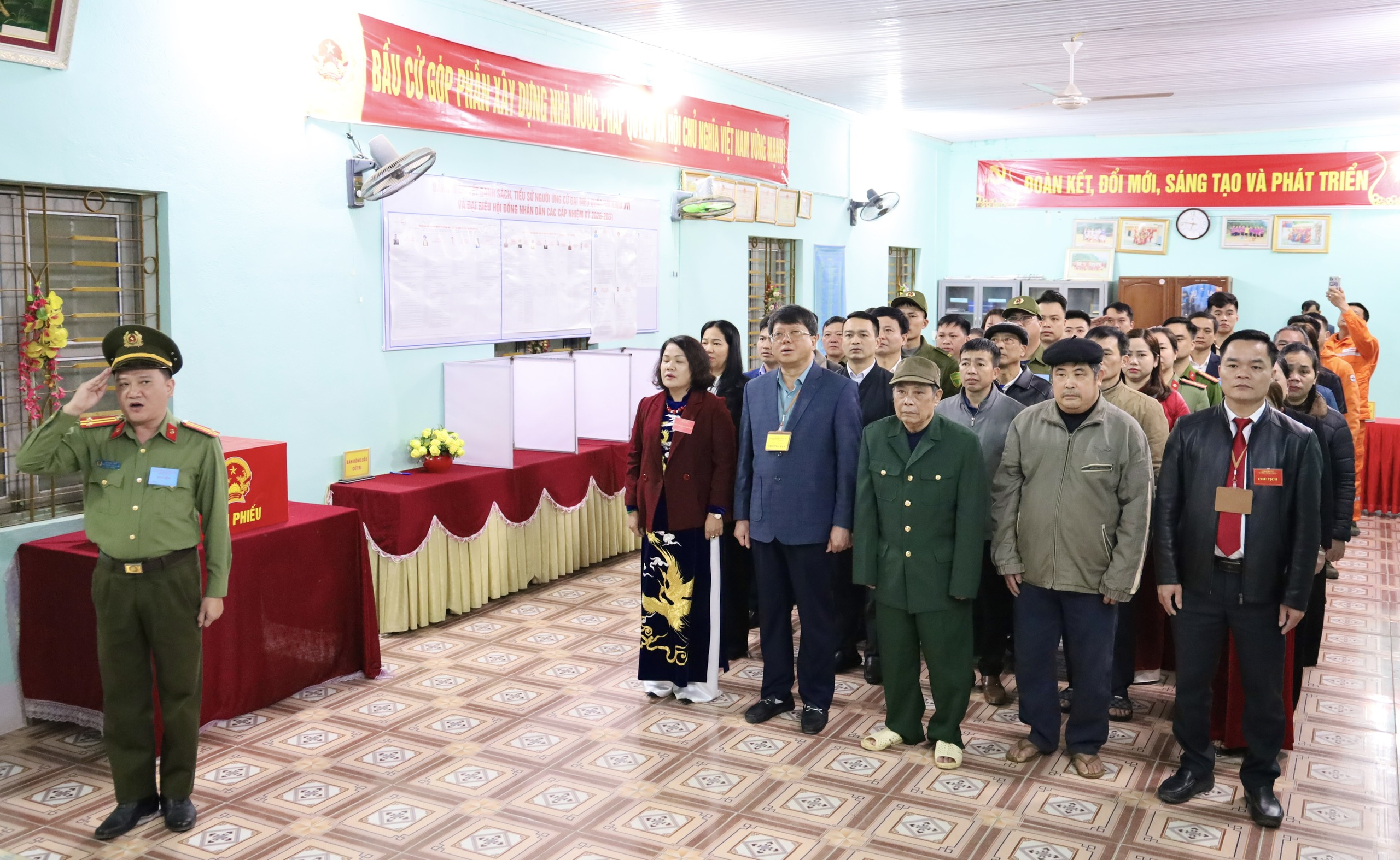 Đồng chí Hà Trung Kiên, Ủy viên Ban Thường vụ Tỉnh ủy, Phó Chủ tịch Thường trực Uỷ ban MTTQ Việt Nam tỉnh và các đại biểu thực hiện nghi thức chào cờ tại Lễ khai mạc cuộc bầu cử.