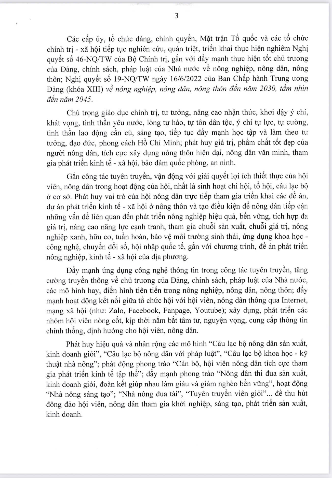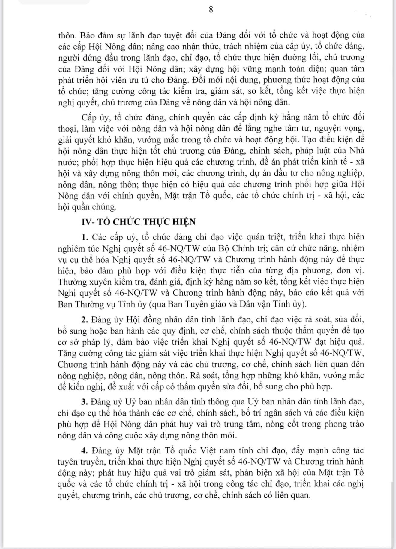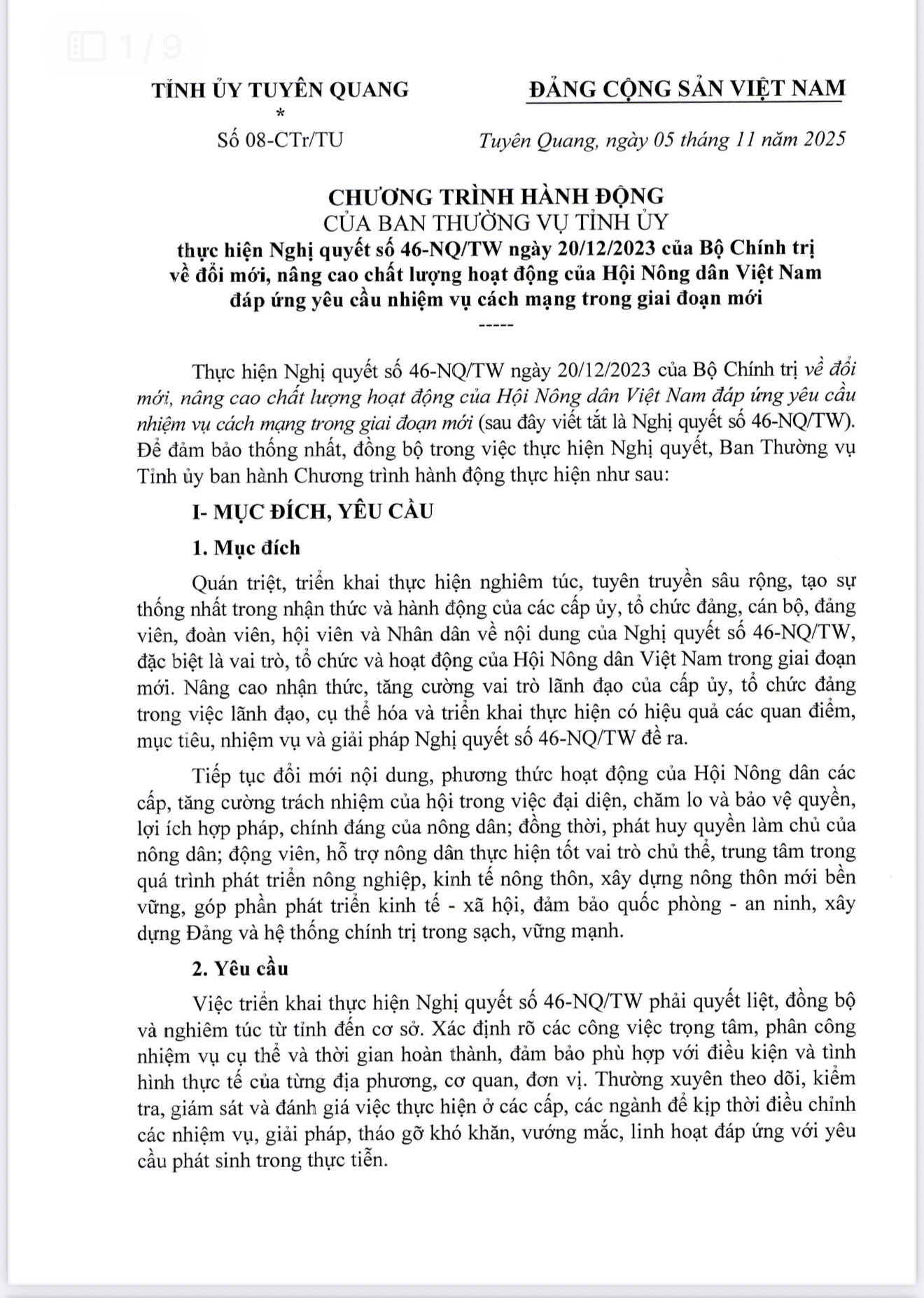 CHƯƠNG TRÌNH HÀNH ĐỘNG CỦA BAN THƯỜNG VỤ TỈNH ỦY THỰC HIỆN NGHỊ QUYẾT SỐ 46-NQ/TW NGÀY 20/12/2023 CỦA BỘ CHÍNH TRỊ VỀ ĐỔI MỚI, NÂNG CAO CHẤT LƯỢNG HOẠT ĐỘNG CỦA HỘI NÔNG DÂN VIỆT NAM ĐÁP ỨNG YÊU CẦU NHIỆM VỤ CÁCH MẠNG TRONG GIAI ĐOẠN MỚI