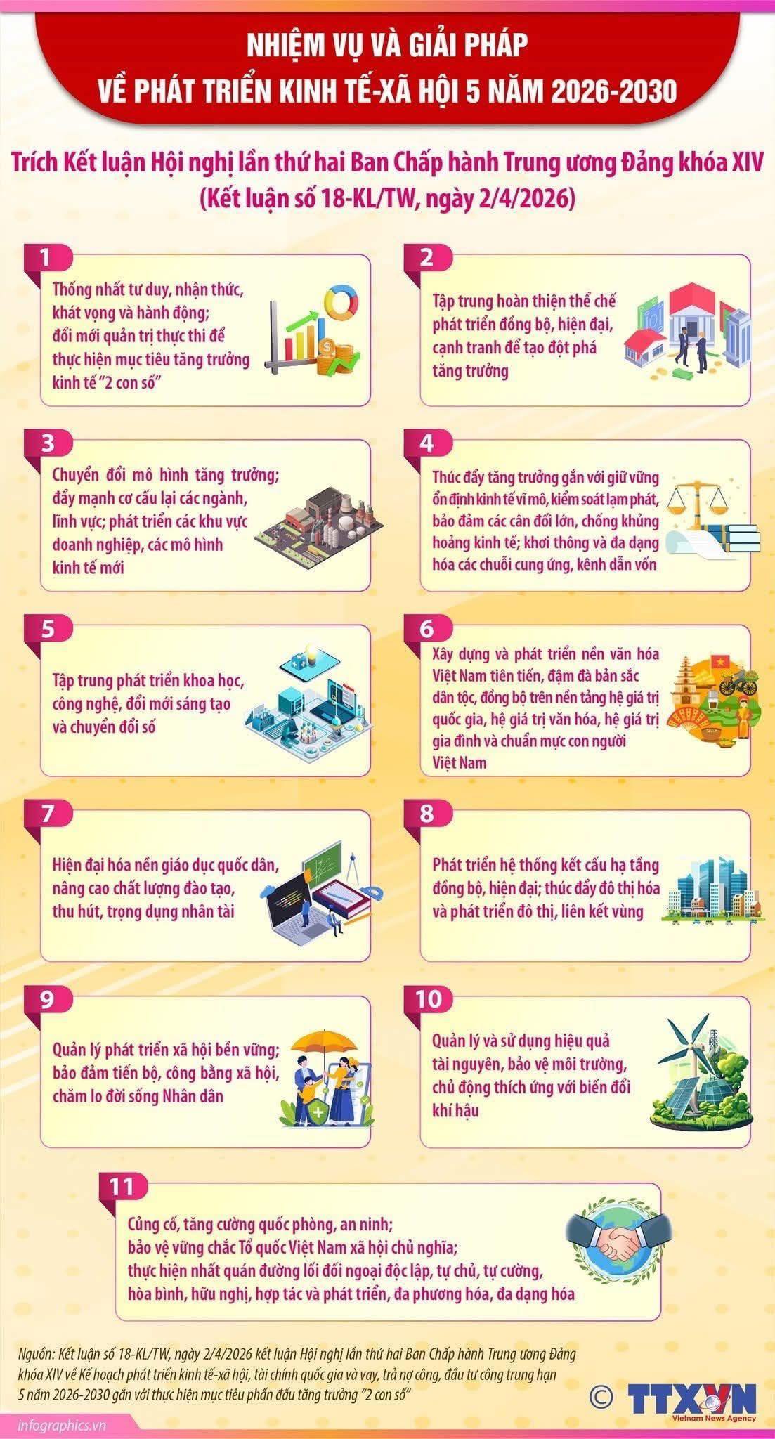 Kết luận số 18-KL/TW ngày 02/4/2026 Hội nghị lần thứ hai Ban Chấp hành Trung ương Đảng khóa XIV về Kế hoạch phát triển kinh tế - xã hội, tài chính quốc gia và vay, trả nợ công, đầu tư công trung hạn 5 năm 2026 - 2030 gắn với thực hiện mục tiêu phấn đấu tăng trưởng "2 con số"